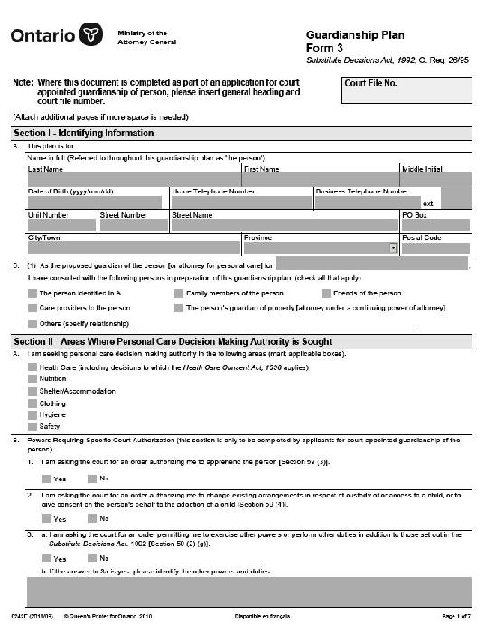 This form must be submitted by a person applying to court under the Substitute Decisions Act, 1992 to be appointed guardian of a person who is incapable of personal care.