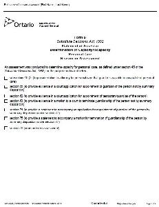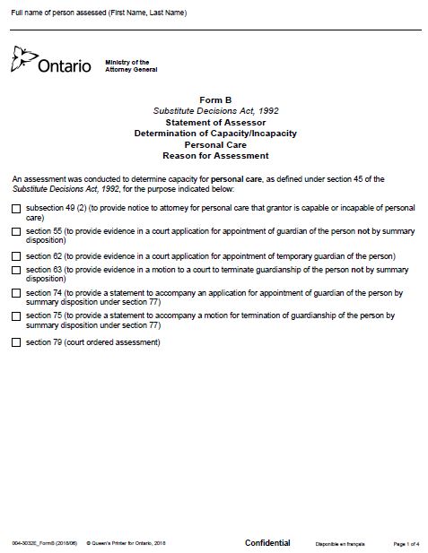Form B Substitute Decisions Act, 1992 Statement of Assessor Determination of Capacity/Incapacity Personal Care Reason for Assessment