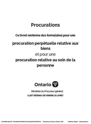 Ce livre contient des instructions et des formulaires pour une procuration continue relative aux biens et aux soins personnels.