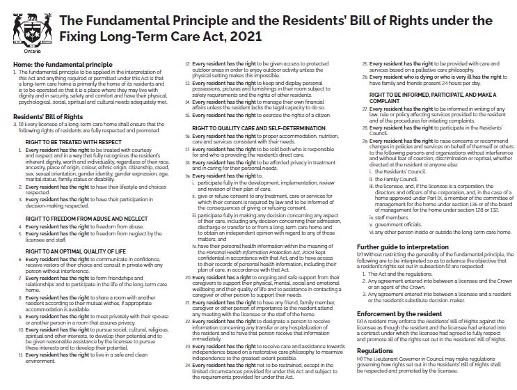 The Fundamental Principle and the Residents' Bill of Rights under the Fixing Long-Term Care Act, 2021