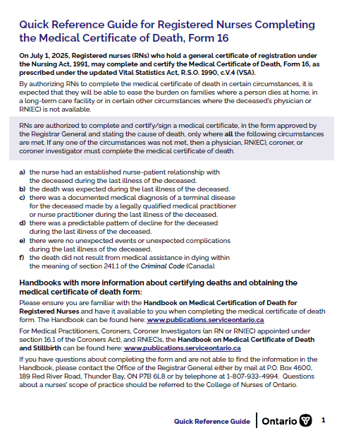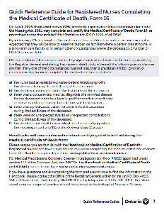 Quick Reference Guide for Registered Nurses Completing the Medical Certificate of Death, Form 16