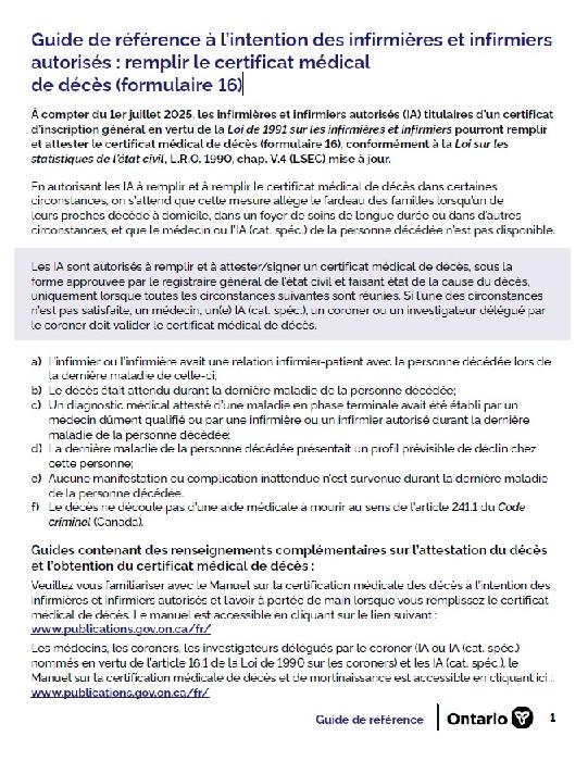 Guide de référence à l’intention des infirmières et infirmiers autorisés : remplir le certificat médical de décès (formulaire 16)