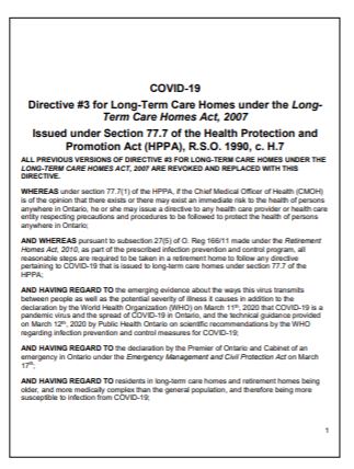 COVID-19 : Directive #3 for Long-Term Care Homes under the Long Term Care Homes Act, 2007 : Issued under Section 77.7 of the Health Protection and Promotion Act (HPPA), R.S.O. 1990, c. H.7.
