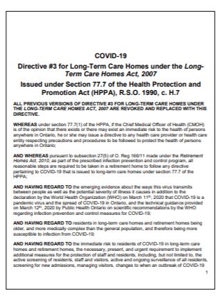 COVID-19 : Directive #3 for Long-Term Care Homes under the Long Term Care Homes Act, 2007 : Issued under Section 77.7 of the Health Protection and Promotion Act (HPPA), R.S.O. 1990, c. H.7