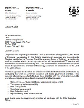 Mandate letter from the Ministry of Energy, Northern Development and Mines to the Ontario Energy Board