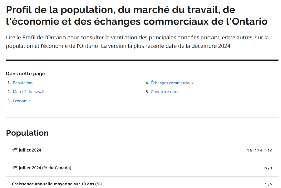 Profil de la population, du marché du travail, de l'économie et des échanges commerciaux de l'Ontario decembre 2024