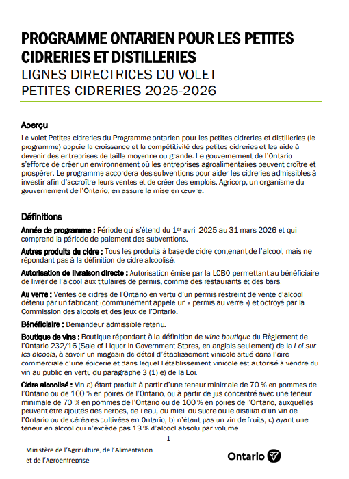 Programme Ontarien pour les petites cidreries et distilleries : lignes directrices du volet petites cidreries 2024-2025