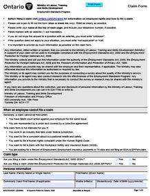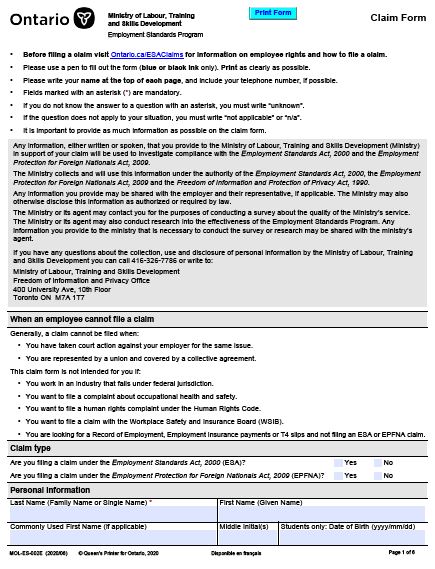 (Online) Employment Standards Claim Form 2020 (MOL-ES-002E)