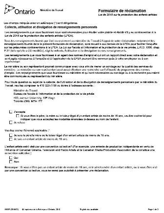 Formulaire : Réclamation Relative aux Enfants Artistes
