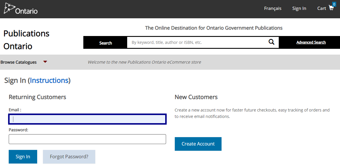 For those customers with restricted access accounts set up by Publications Ontario and who order online, an email has been sent to you. It outlines information pertaining to a “one-time sign in” process which is required to register and access your new account. To get started with the one-time “sign in” process click here. Before you begin, you will need your old eCommerce system User ID and the one-time code provided in the email to complete this process. Note the system will only allow one attempt.