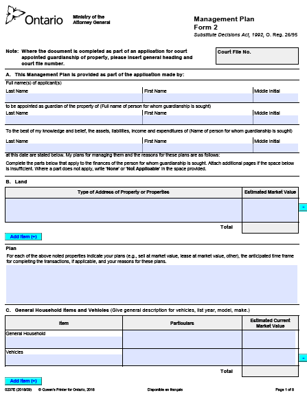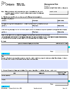 Un plan de gestion des biens doit être soumis lorsqu'une personne demande de remplacer le Tuteur et curateur public en qualité de tuteur légal aux biens de l'incapable (sur le formulaire 1). Le plan de gestion décrit le plan de l'auteur de la demande pour la gestion des biens de l'incapable.