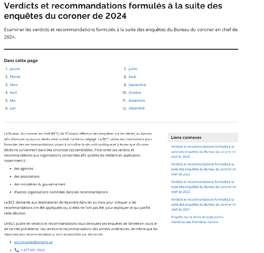 Verdicts et recommandations formulés à la suite des enquêtes du coroner 2024