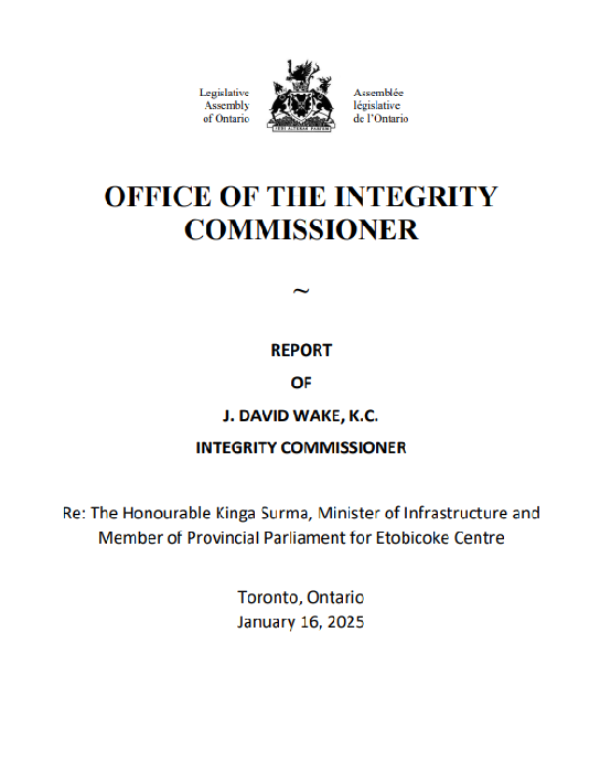 Report of the Honourable J. David Wake, Integrity Commissioner Re: The Honourable Kinga Surma, Minister of Infrastructure and Member of Provincial Parliament for Etobicoke Centre