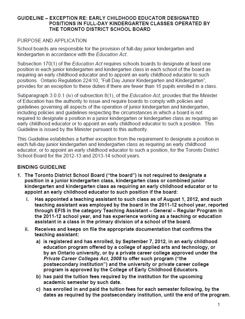 GUIDELINE - EXCEPTION RE: EARLY CHILDHOOD EDUCATOR DESIGNATED POSITIONS IN FULL-DAY KINDERGARTEN CLASSES OPERATED BY THE TORONTO DISTRICT SCHOOL BOARD