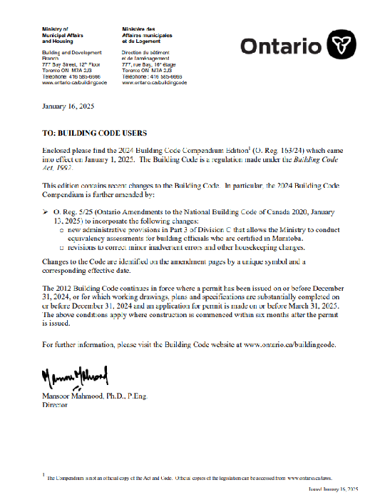 Amendment Package # 2 (O. Reg. 5/25 updated to January 16, 2025) to the 2024 Building Code Compendium